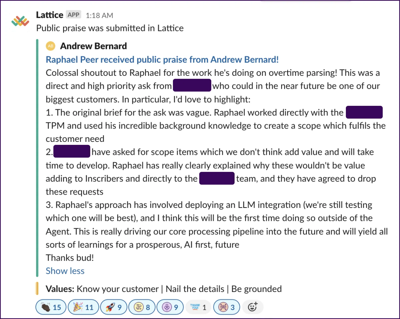 Here are the company values we landed on and recently rolled out to our team — as well as some examples of them in action captured via shoutouts in our #words-of-praise channel on Slack.